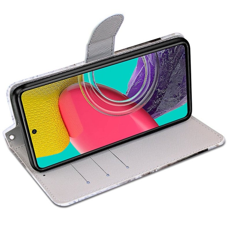 Säkra Din Samsung Galaxy M53 5G Med Detta Marmor- Och Glittertriangelfodral Som Kommer Med En Rem.
