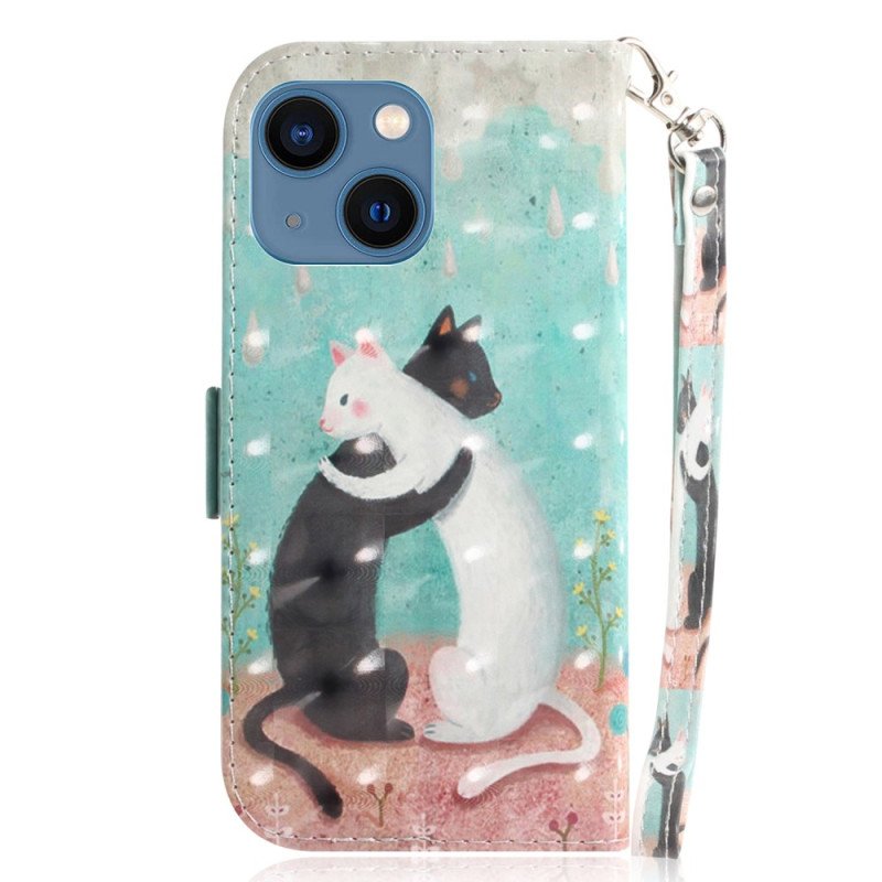 Folio-fodral iPhone 15 Plus Med Kedjar Svart Katt Vit Katt Med Rem
