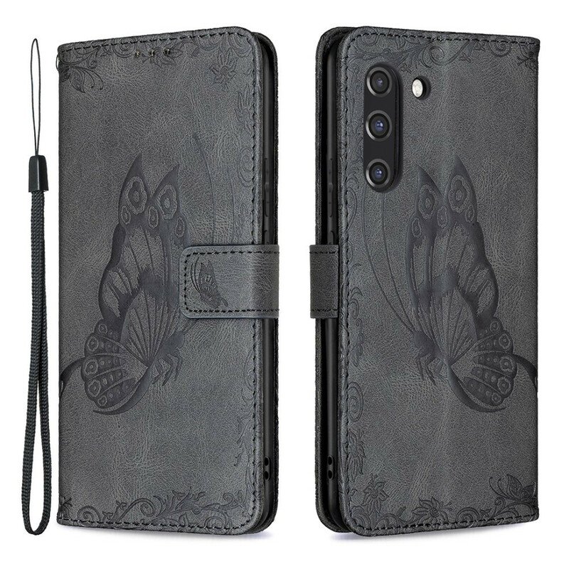 Här Är Ett Suveränt Fodral I Fint Läderimitation Dekorerat Med En Barockfjäril För Att Säkra Din Samsung Galaxy S21 Fe Och Som Kommer Med En Avtagbar Rem.